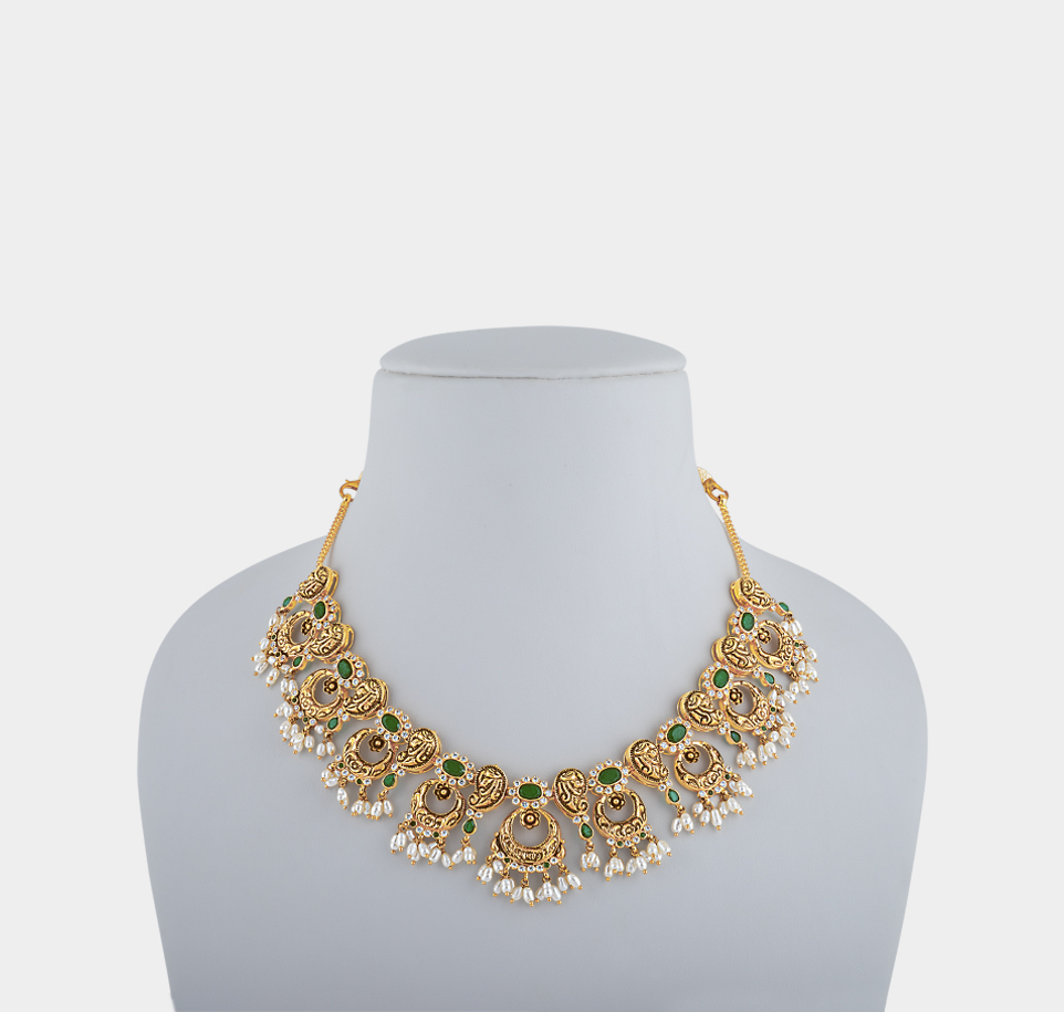 The Guta Pusalu design hailing from the land of Andhra Pradesh and the mango motifs hailing from Tamil Nadu, combined with a crescent-shaped design favoured by all. Inset with beautifully-cut emeralds, white stones and small white pearls, this necklace transcends boundaries and showcases the pride of our heritage.