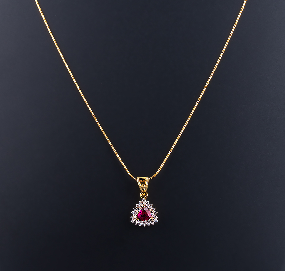 A scintillating ruby red stone surrounded by sparkling white diamonds set in floral patterns delicately dangling on a slim 22k yellow gold chain. Lovingly handcrafted, this is a perfect accessory that will add the hint of glamour